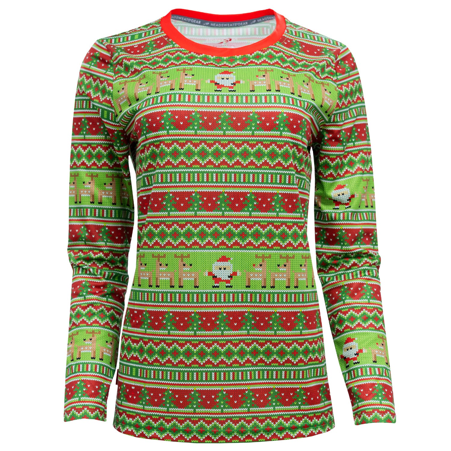 Featuring a knit-inspired Christmas pattern with reindeer and Santa, this long sleeve is built for winter runs, holiday workouts, fun races, or casual seasonal wear. The moisture-wicking fabric helps keep you dry, while the women’s athletic fit provides a flattering, comfortable feel—so you can go ugly and perform.